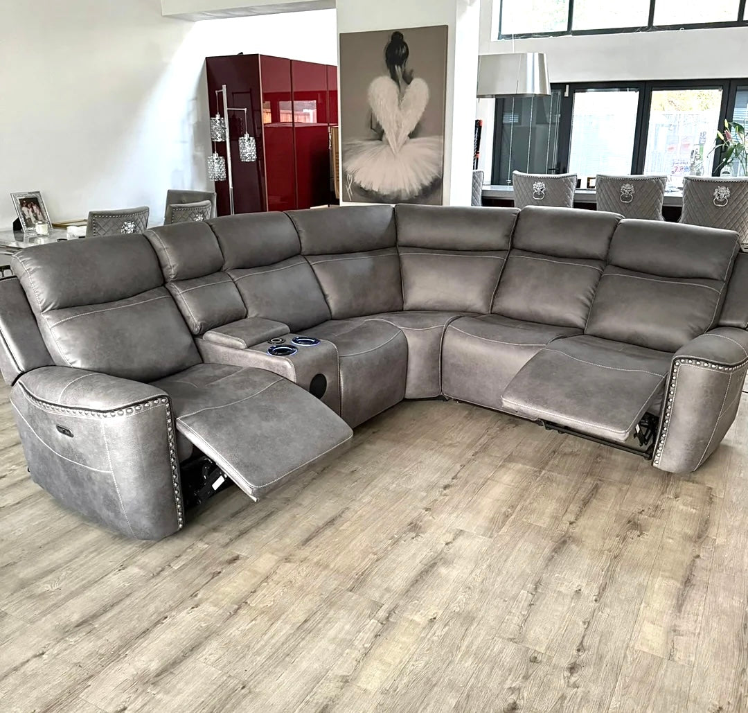 Measurements 290cm by 255cm (As shown in the photo) but this can be changed by moving the middle seating and console unit.