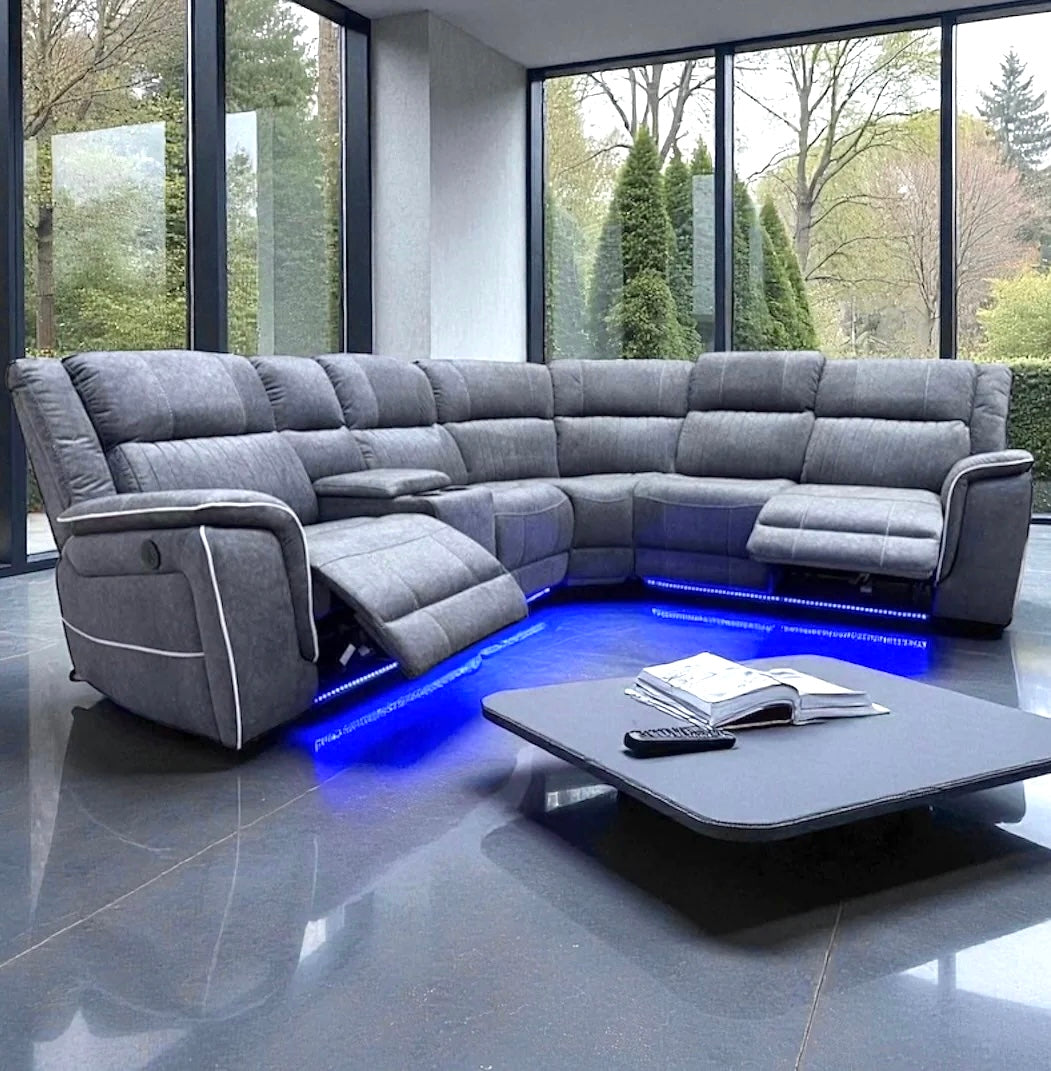 The NEO led Corner Sofa features electric recliners on both end seats. The Grey fabric has modern trim on the backs. The sofa also contains a console unit in the right hand seat and has electric recliners on the seats at both ends.